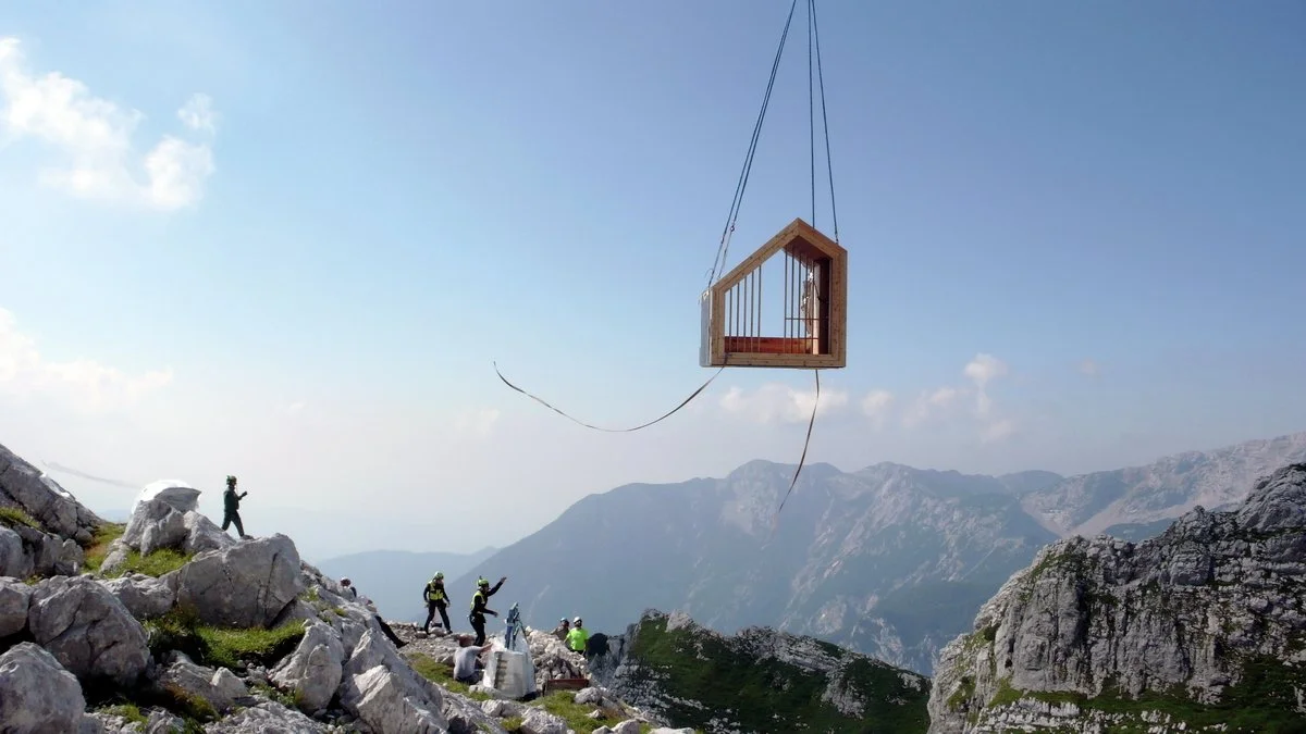 fig. 17 Helicopter installation of Alpine Shelter Skuta by the Slovenian Armed Forces.