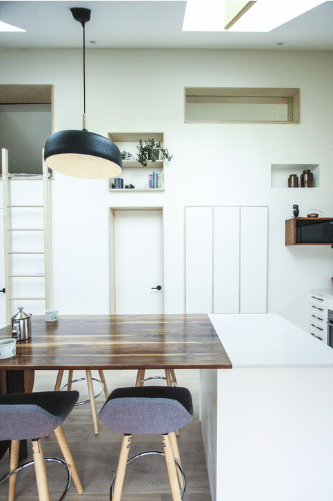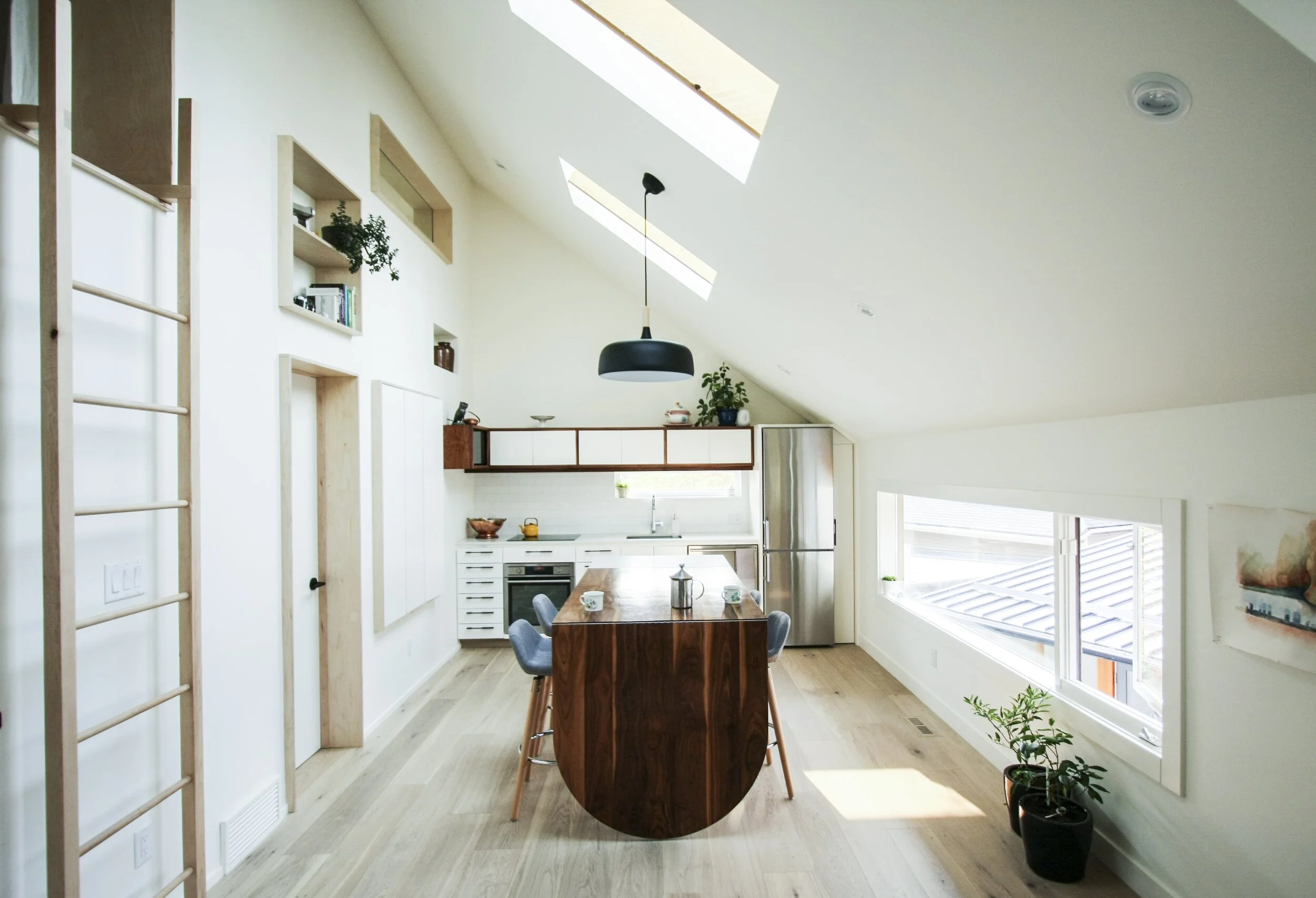 The design of the Withrow Laneway House aims to reflect the changing needs of Calgarians with inventive and adaptable uses of space. The compact living solutions include a built-in dining room table that folds out to accommodate large gatherings, storage space integrated into the framing of walls, and a sleeping loft in the vaulted ceiling space.