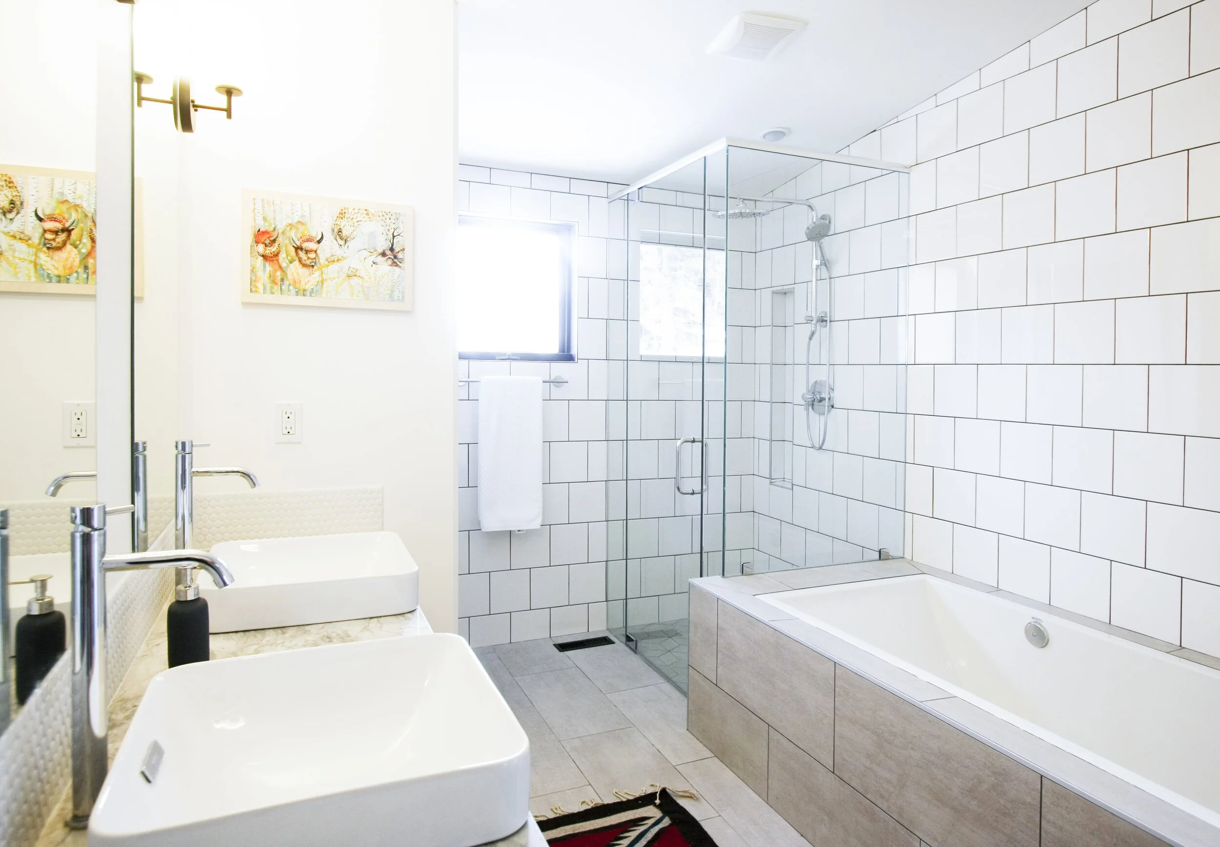 Features of the house that were previously concealed, such as lath and plaster walls and a massive riverstone fireplace, were exposed as artifacts of past construction methods and highlighted against contemporary finishes.