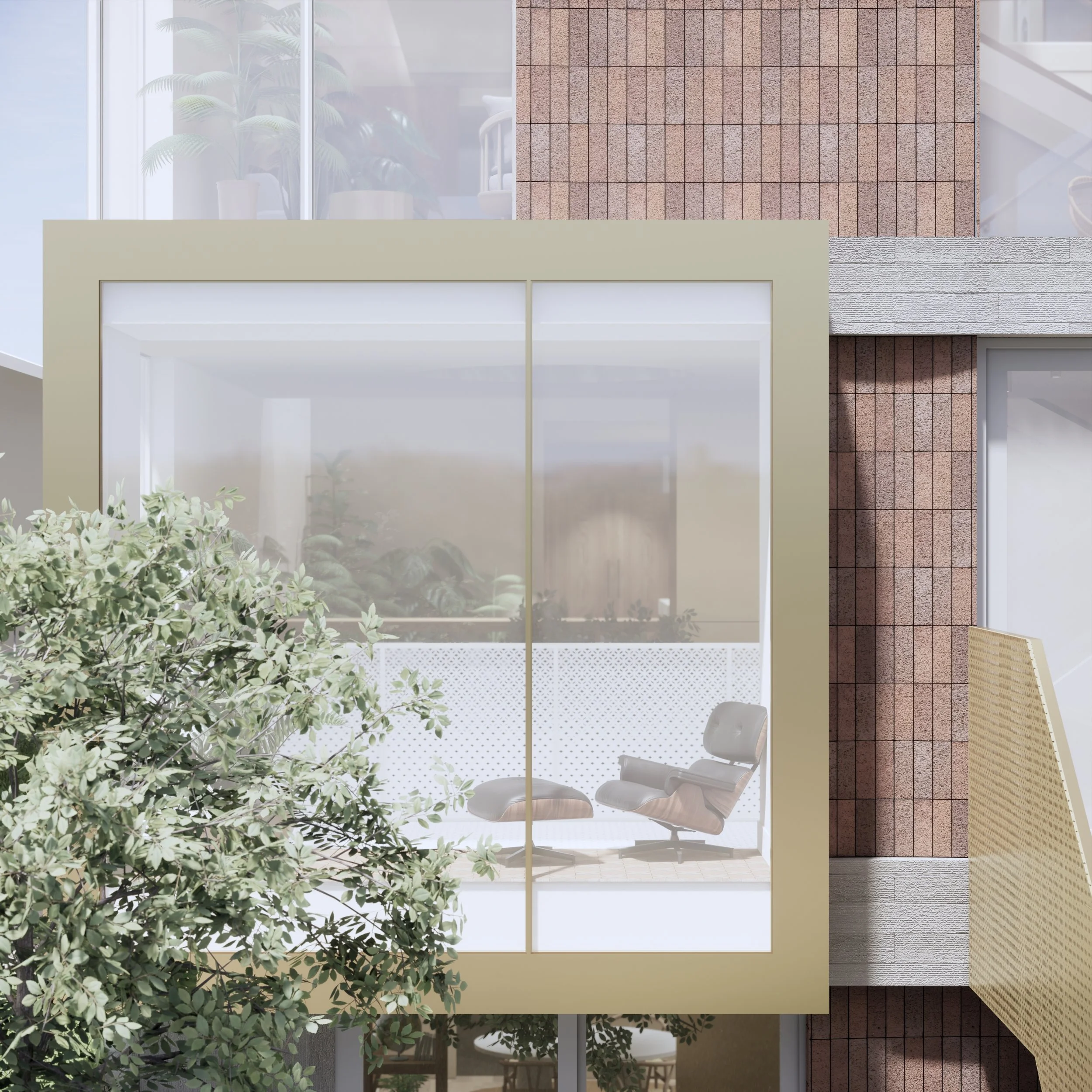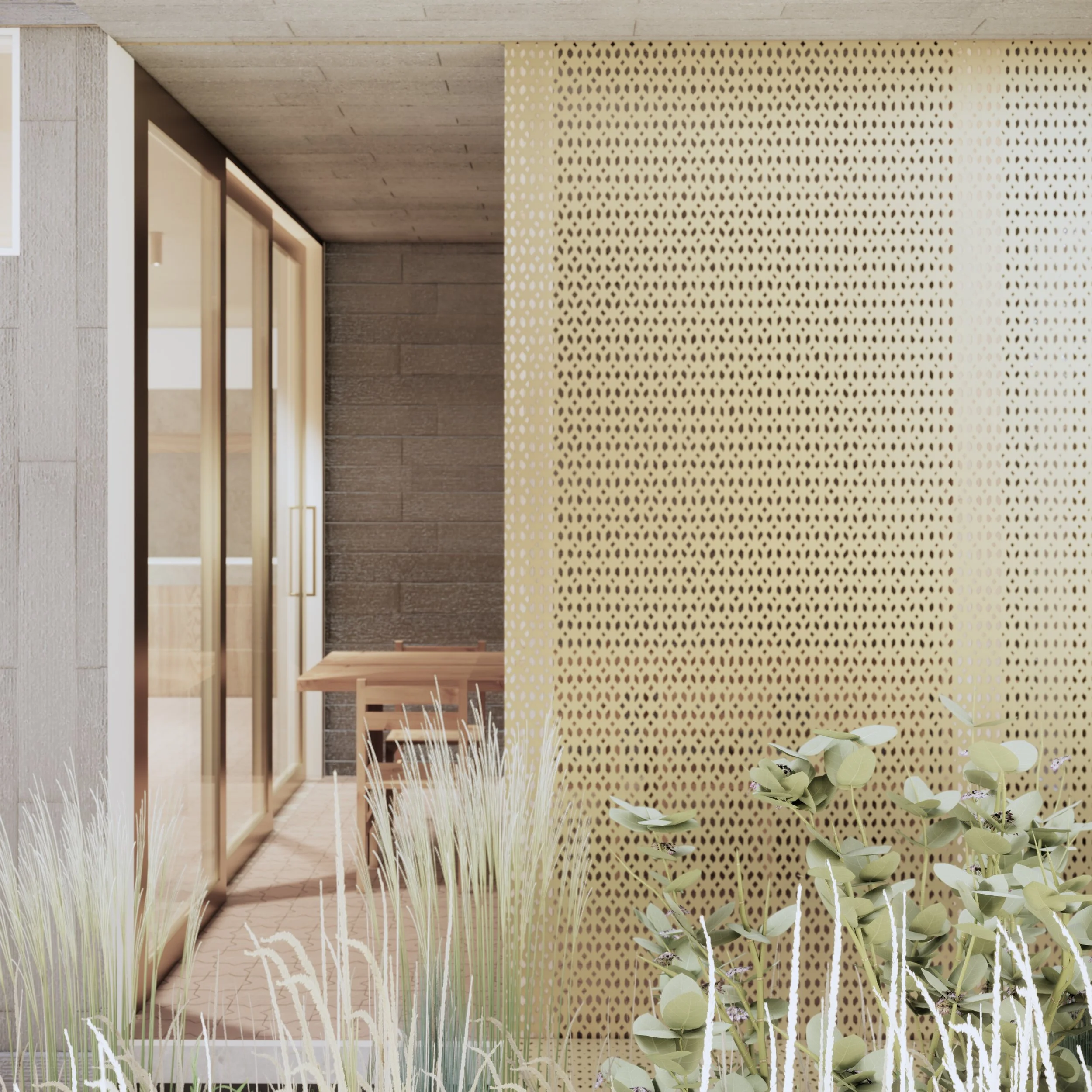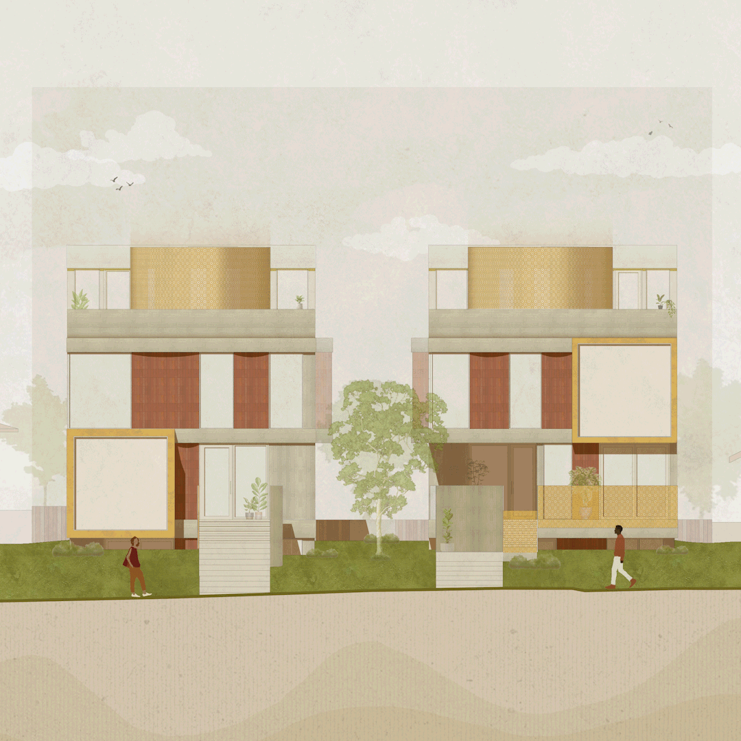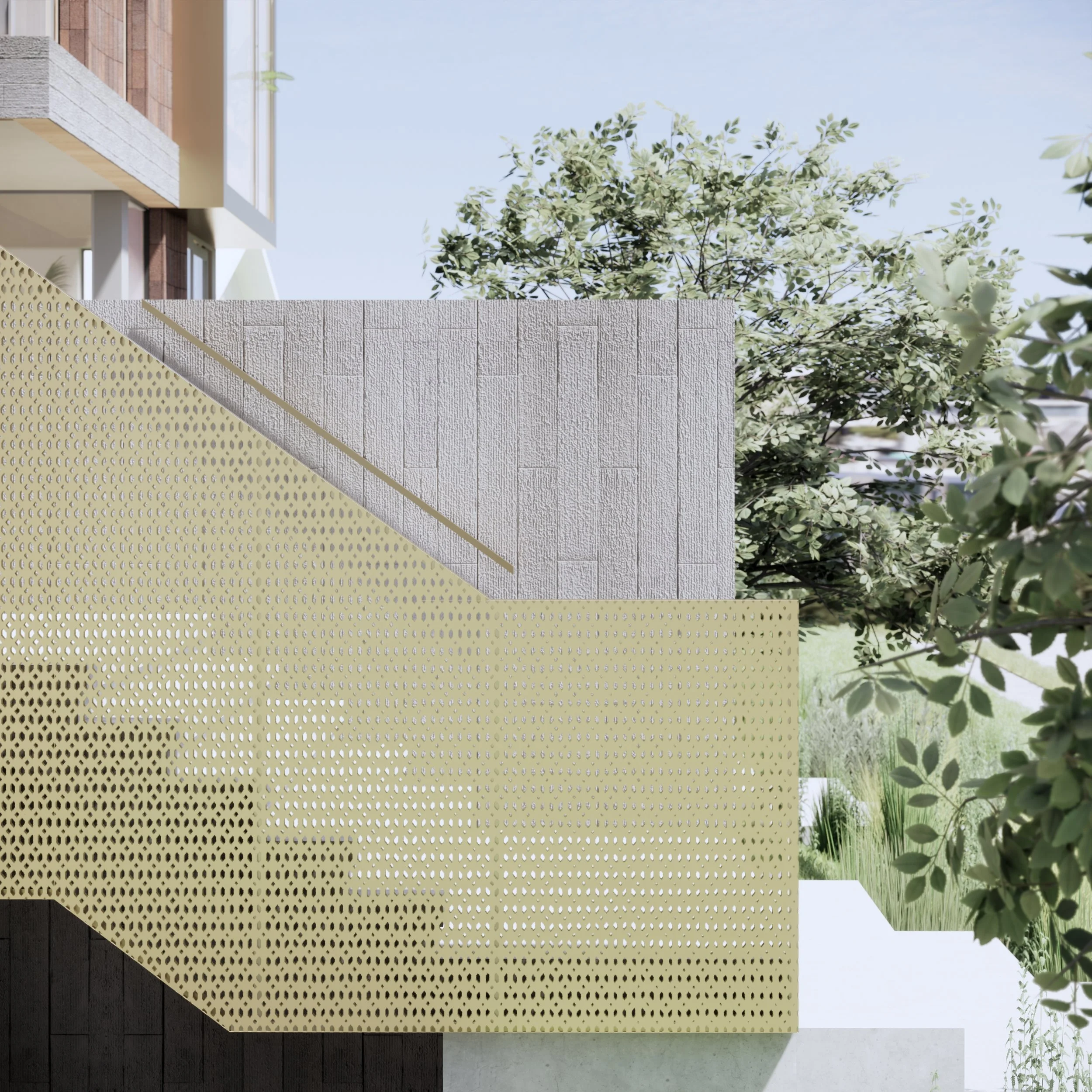 Gold-patterned exterior elements evoke the gilded ornament of the Golden Temple, translated here into subtle cladding and detailing that bring warmth, richness, and spiritual resonance to the front of the homes.