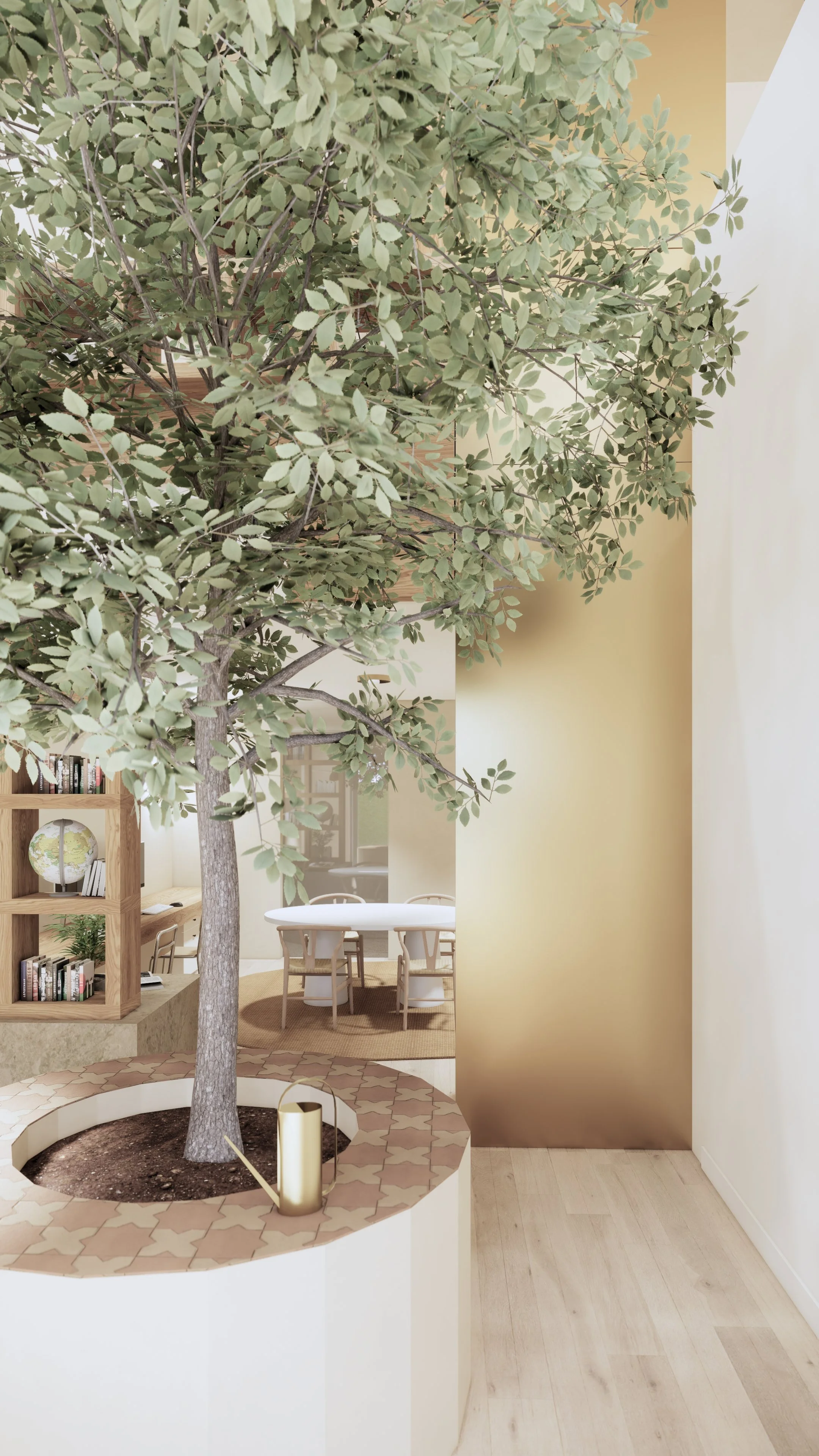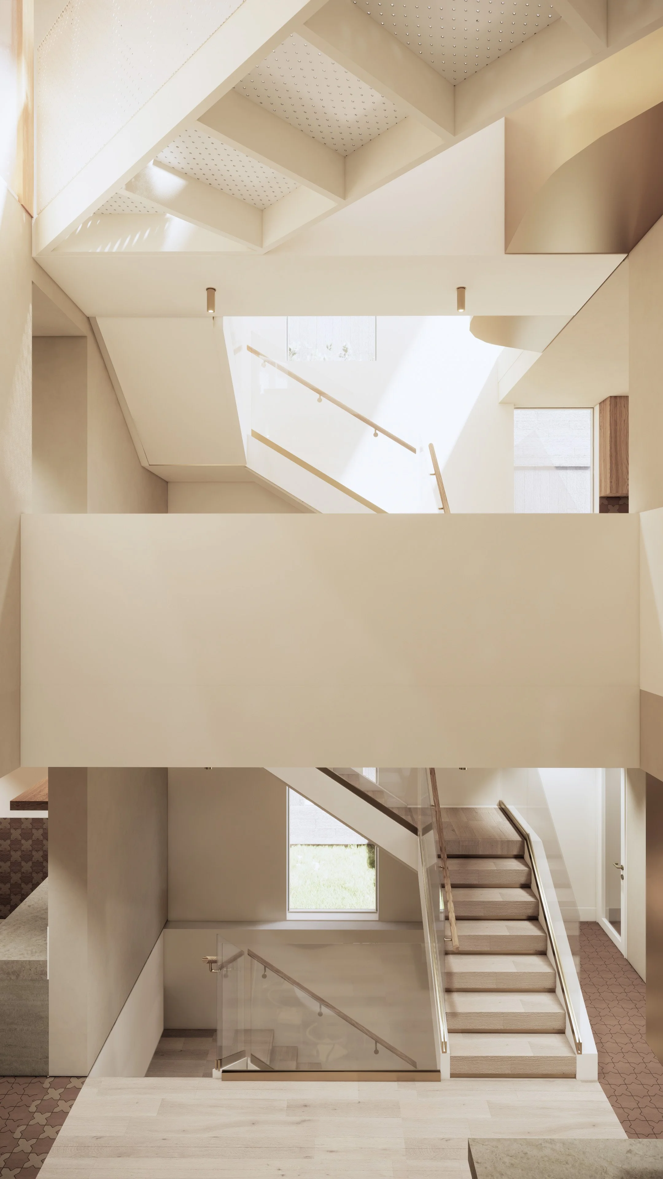 In the brother’s house, a tree rooted in the homeschooling room on the ground floor provides a natural canopy for study, anchoring the architecture to the earth and drawing the eye upward through the vertical layers.