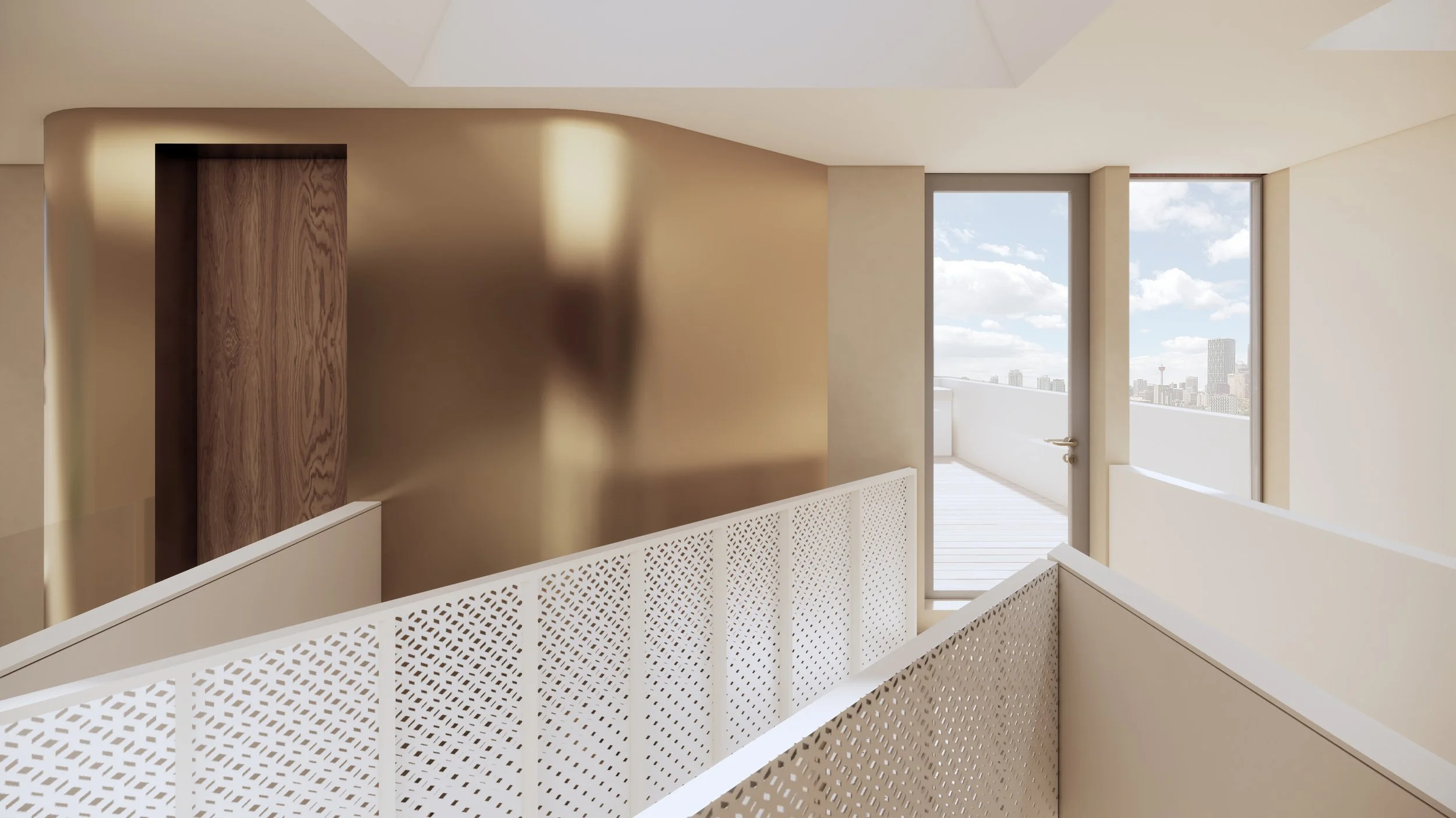 Bridges span the open spaces, connecting rooms and carrying the spirit of chardi kala, the rising optimism and enduring energy central to Sikh life. This upward movement culminates in the prayer room, the spiritual heart of the houses, whose curving, cornerless geometry symbolizes divine unity and whose gold-patterned surfaces evoke the Golden Temple.