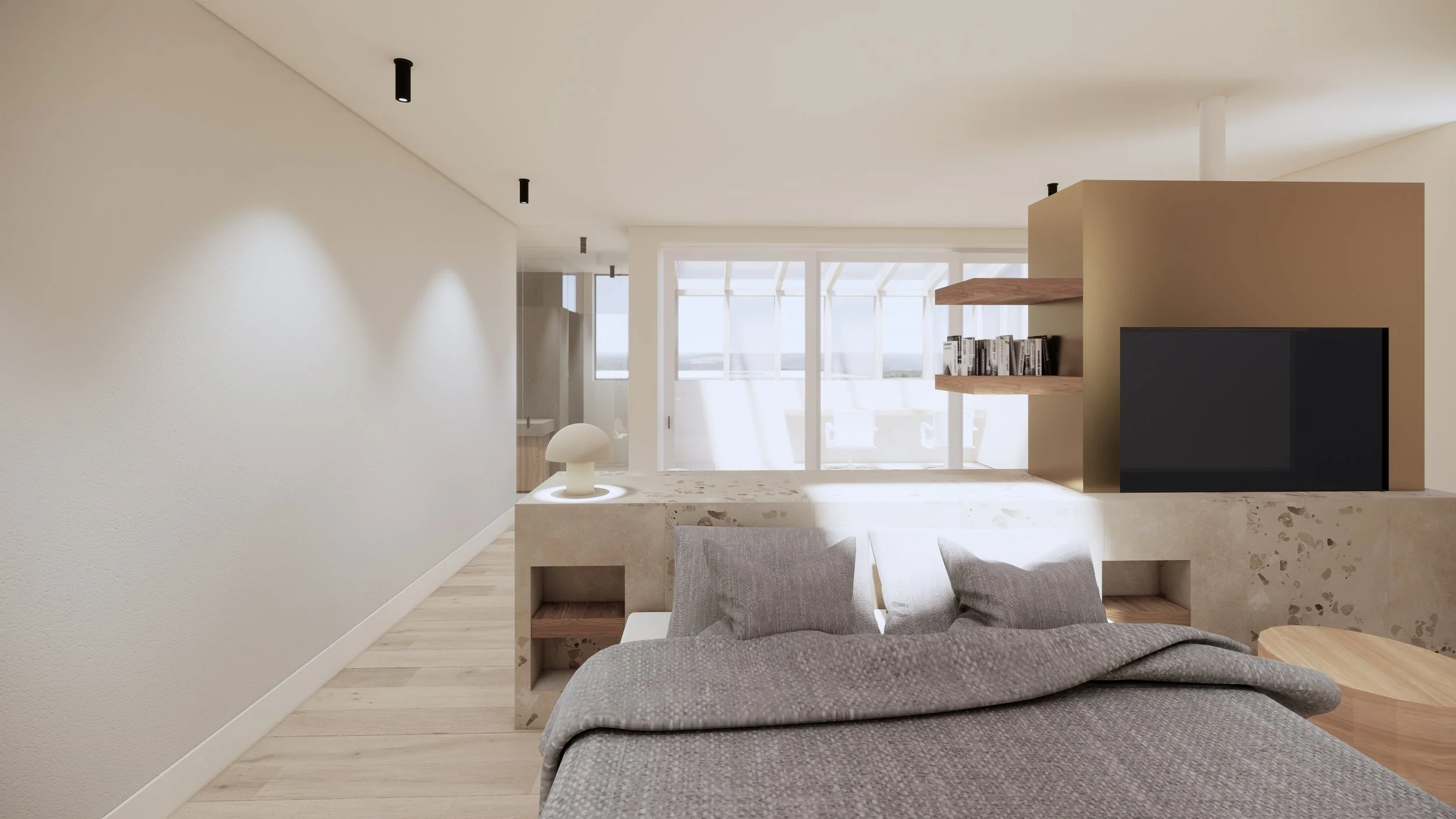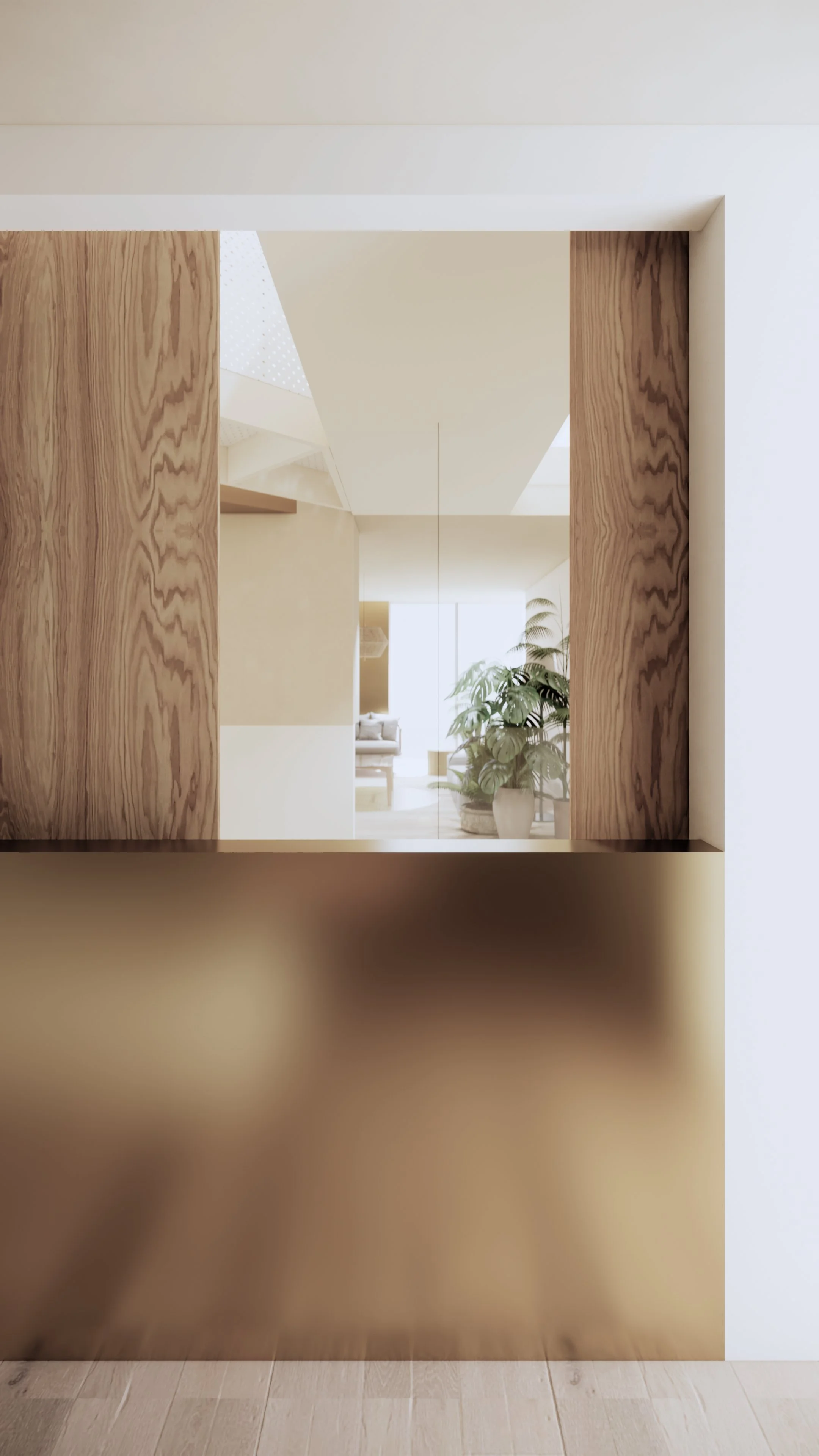In the brother’s home, an interior bedroom overlooking the living room uses a sliding shutter to modulate privacy and daylight, revealing or shielding the space as needed.