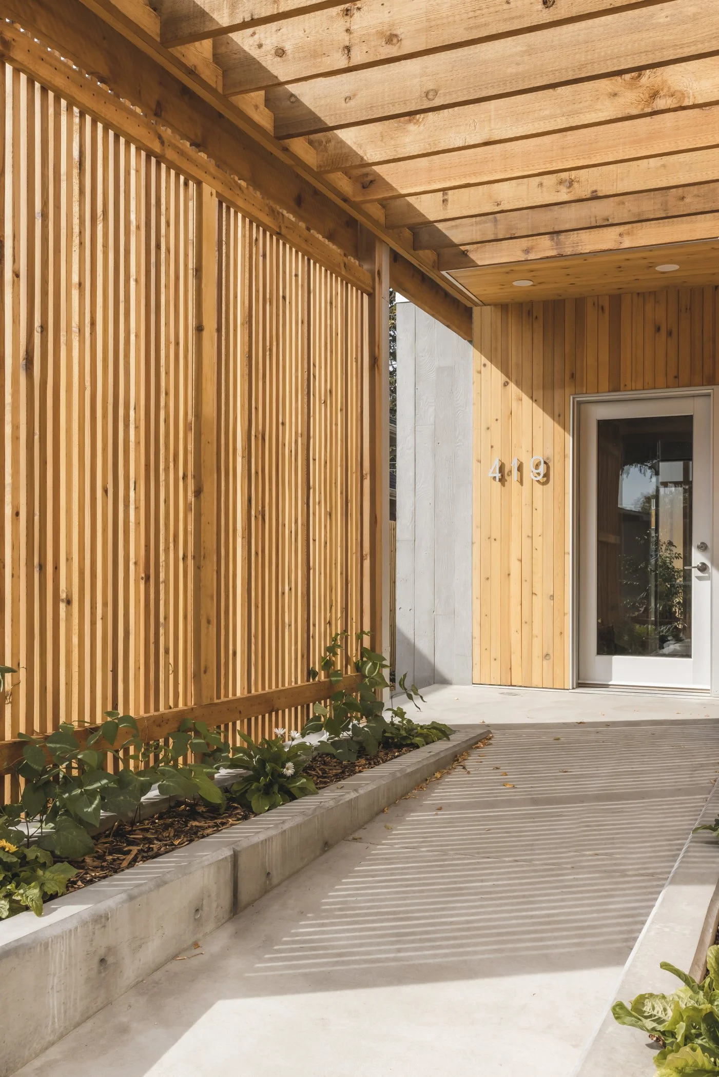 Design considerations for ageing in place start right at the home's front entry. A gentle ramp carries you up from the street to the front door, which is sheltered by an overhead canopy and flanked by a custom bench upon which to place items or to rest momentarily while entering and exiting.