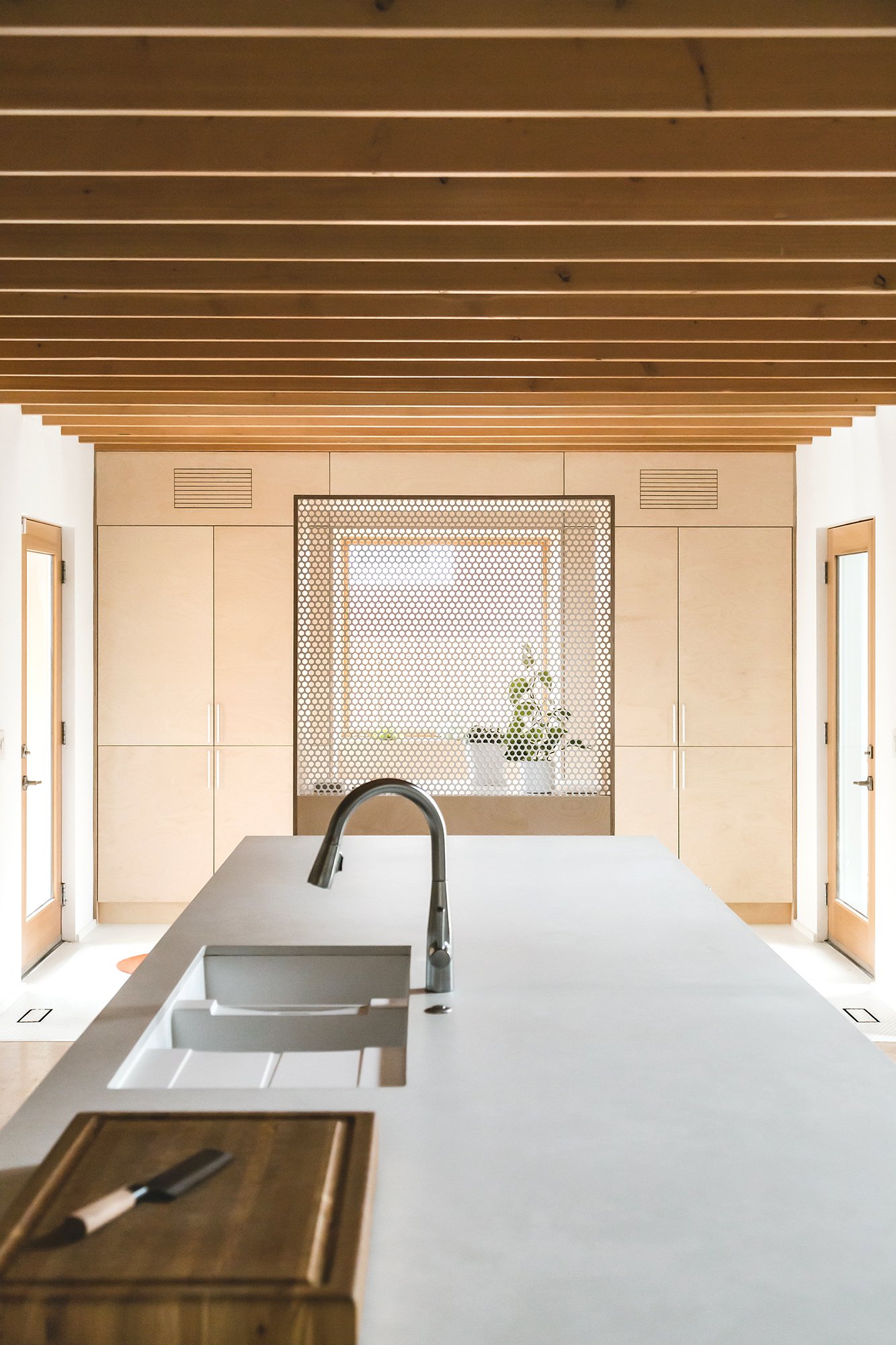 The vaulted main space works in unison with the home's east-west orientation to fill the main rooms with ample natural light throughout the day. A translucent external solarium adjacent to the dining room diffuses the direct sunlight to make the main spaces of the home comfortable and inviting.